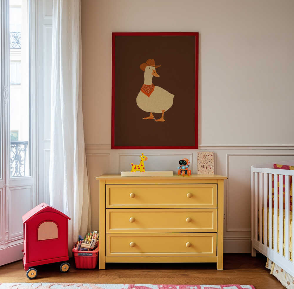 Breng een vleugje speelse charme in je interieur met deze betoverende wanddecoratie van Bo the Cowboy Duck, gekleed in warme aardetinten met zijn kenmerkende hoed en sjaaltje tegen een rijke bruine achtergrond. Het minimalistische ontwerp en de evenwichtige kleuren zorgen voor een rustige sfeer zonder de ruimte te overheersen. Ontworpen om zowel tijdloos als vrolijk te zijn, past het perfect boven het babybedje, in een leeshoek of bij het bureau. Een schattige keuze voor de kinderkamer, babykamer of moderne gezinsruimte – en moeiteloos te combineren met Scandinavische woonstijlen en galerijmuren. Gedrukt op mat papier van museumkwaliteit dat jarenlang zijn kleur en detail behoudt.